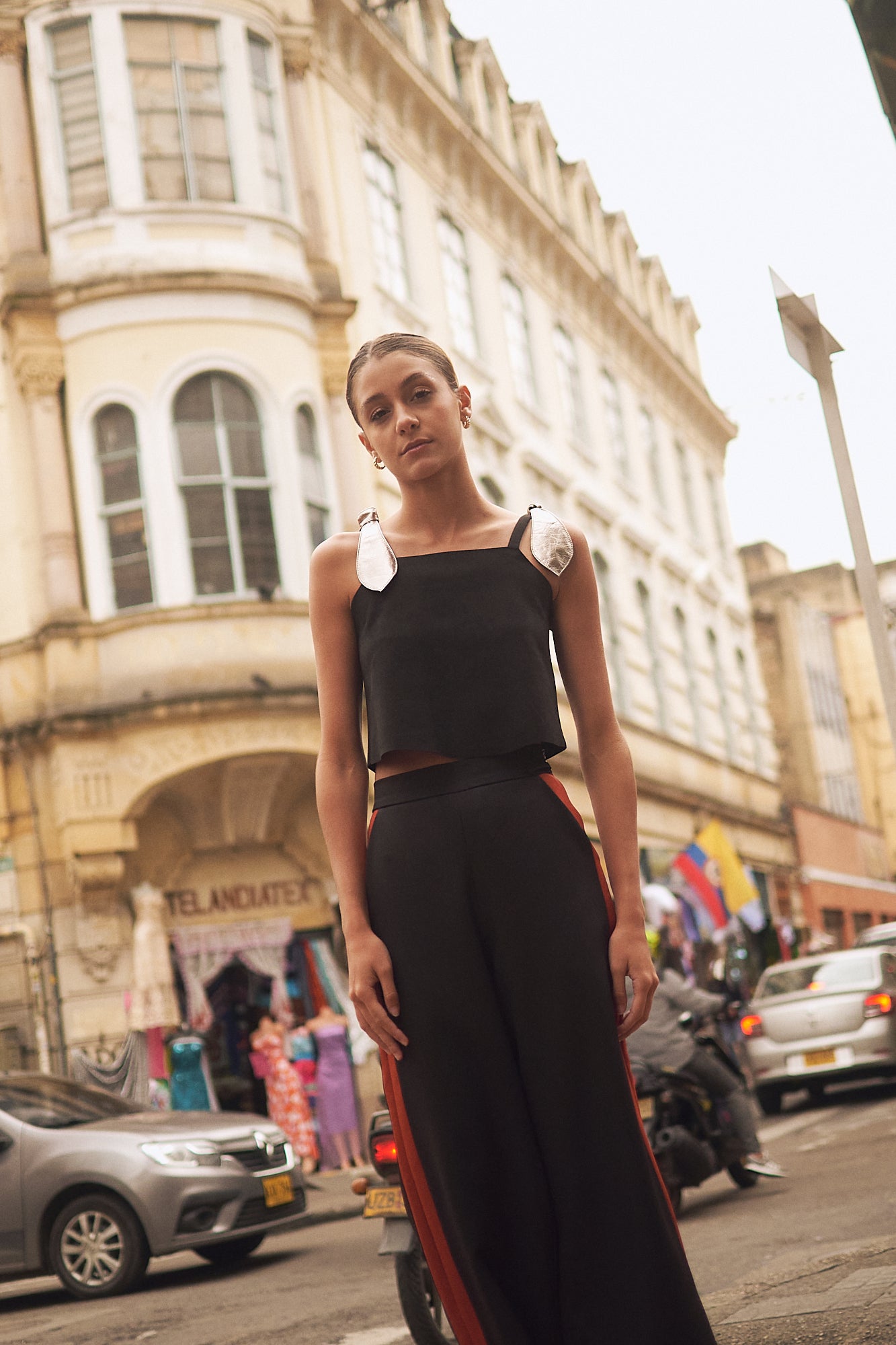 Nuestro CROP TOP MINI ALAS con tiras en cuero de confección, es la prenda ideal para quien quiere destacar dentro de sus MUST o esenciales. La altura del TOP es a la cintura.