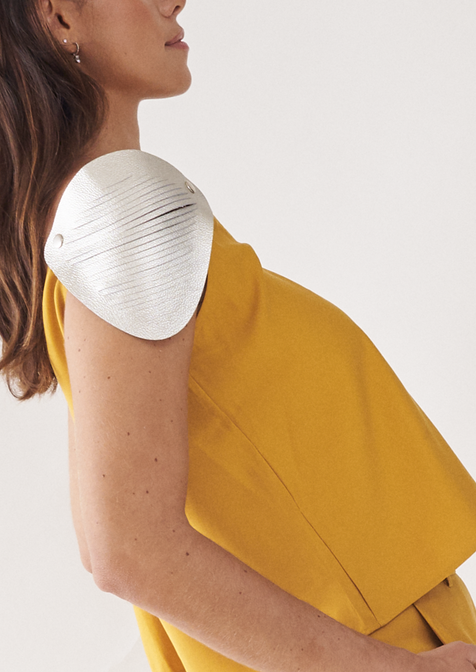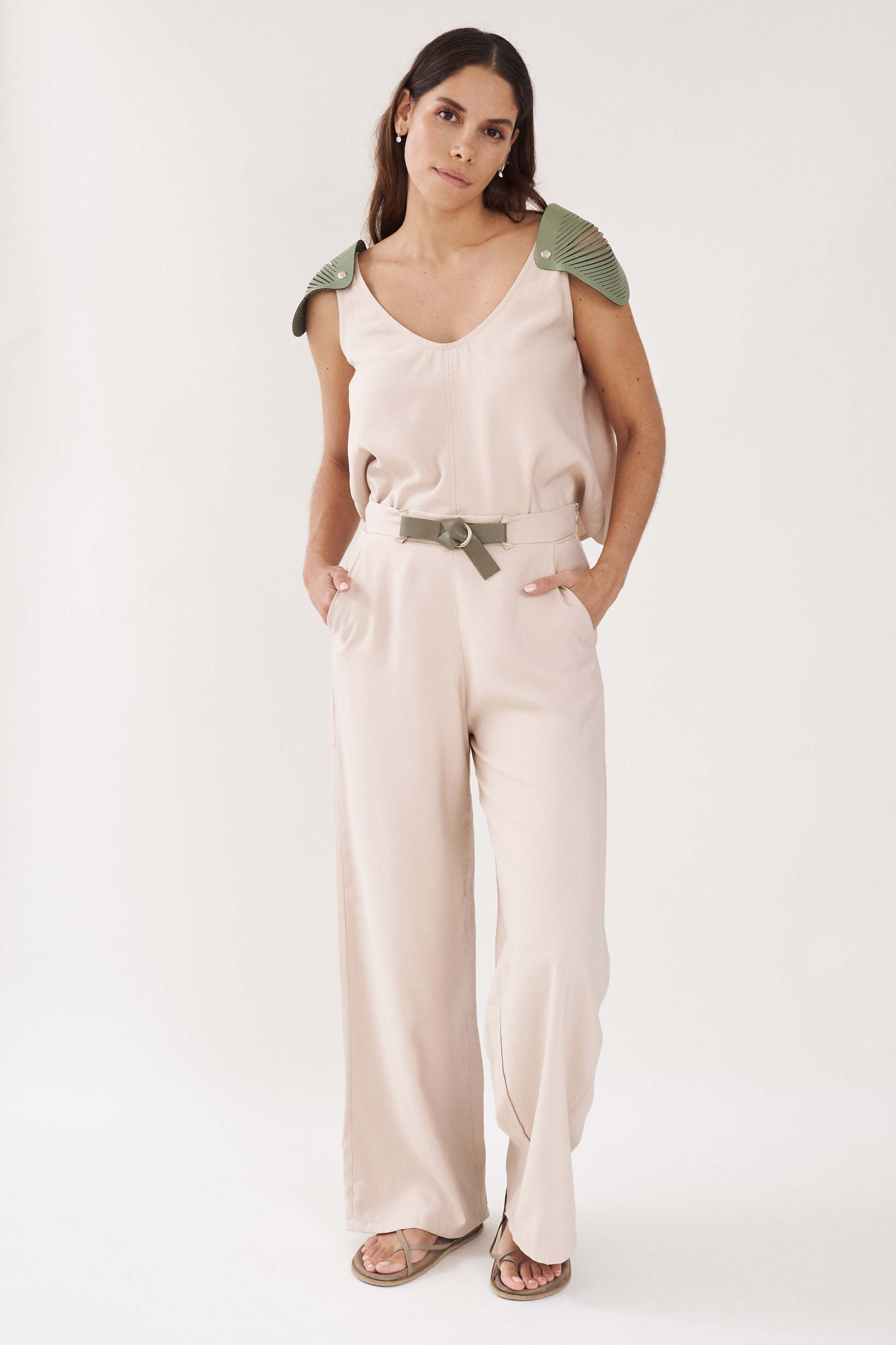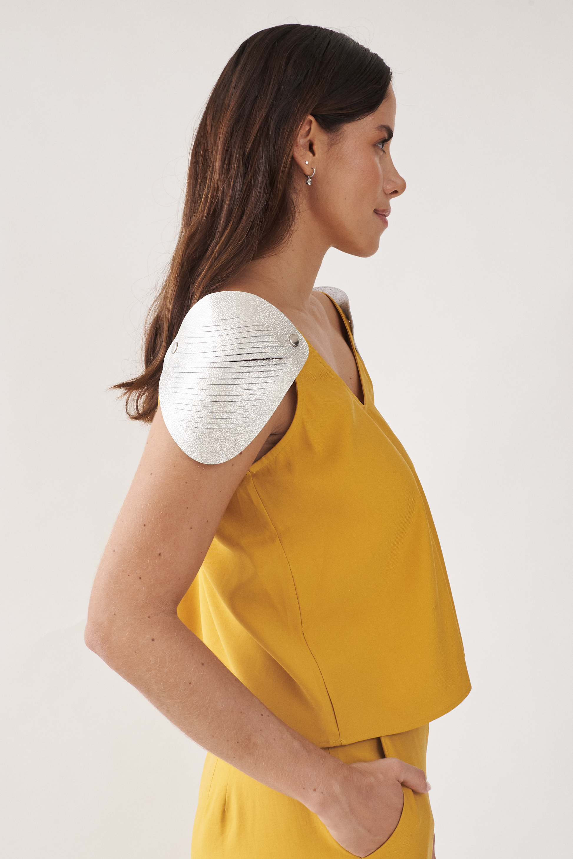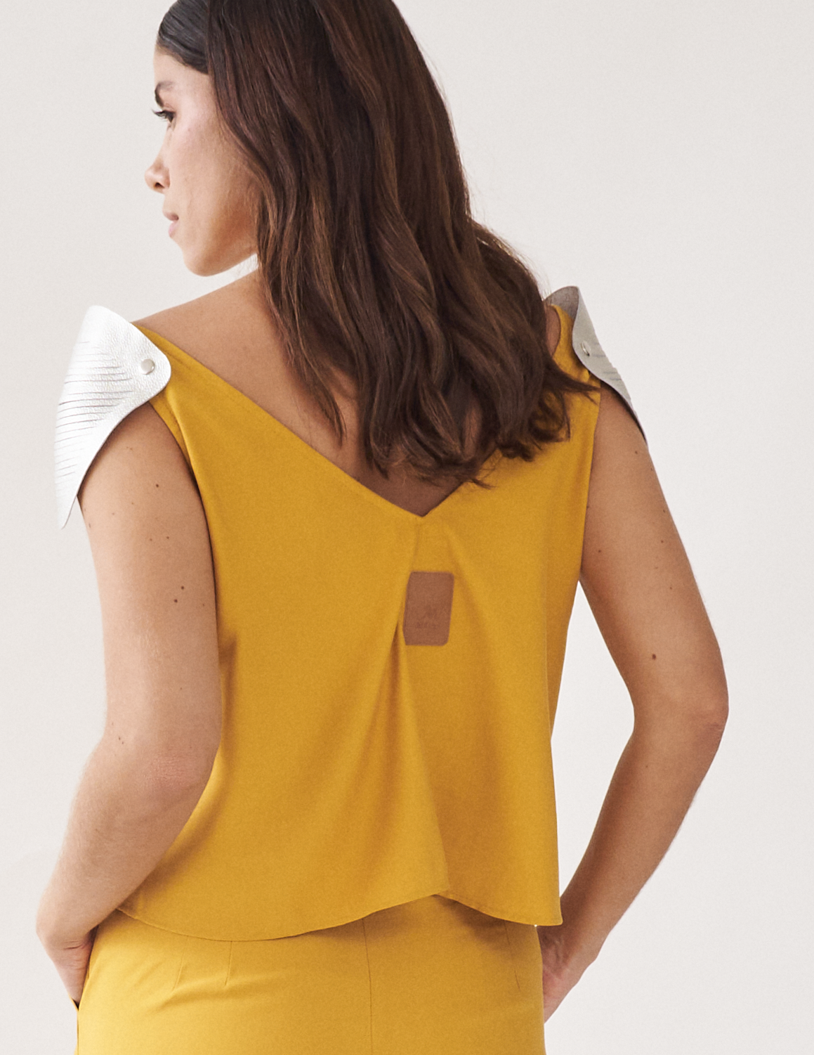 TOP CALIMA AGALLAS, Top con escote en pecho y espalda tipo V. Silueta amplia y forma campana . Accesorio en cuero 100%, removible para lavado. Composición de la tela: 90% rayón 10% algodón.