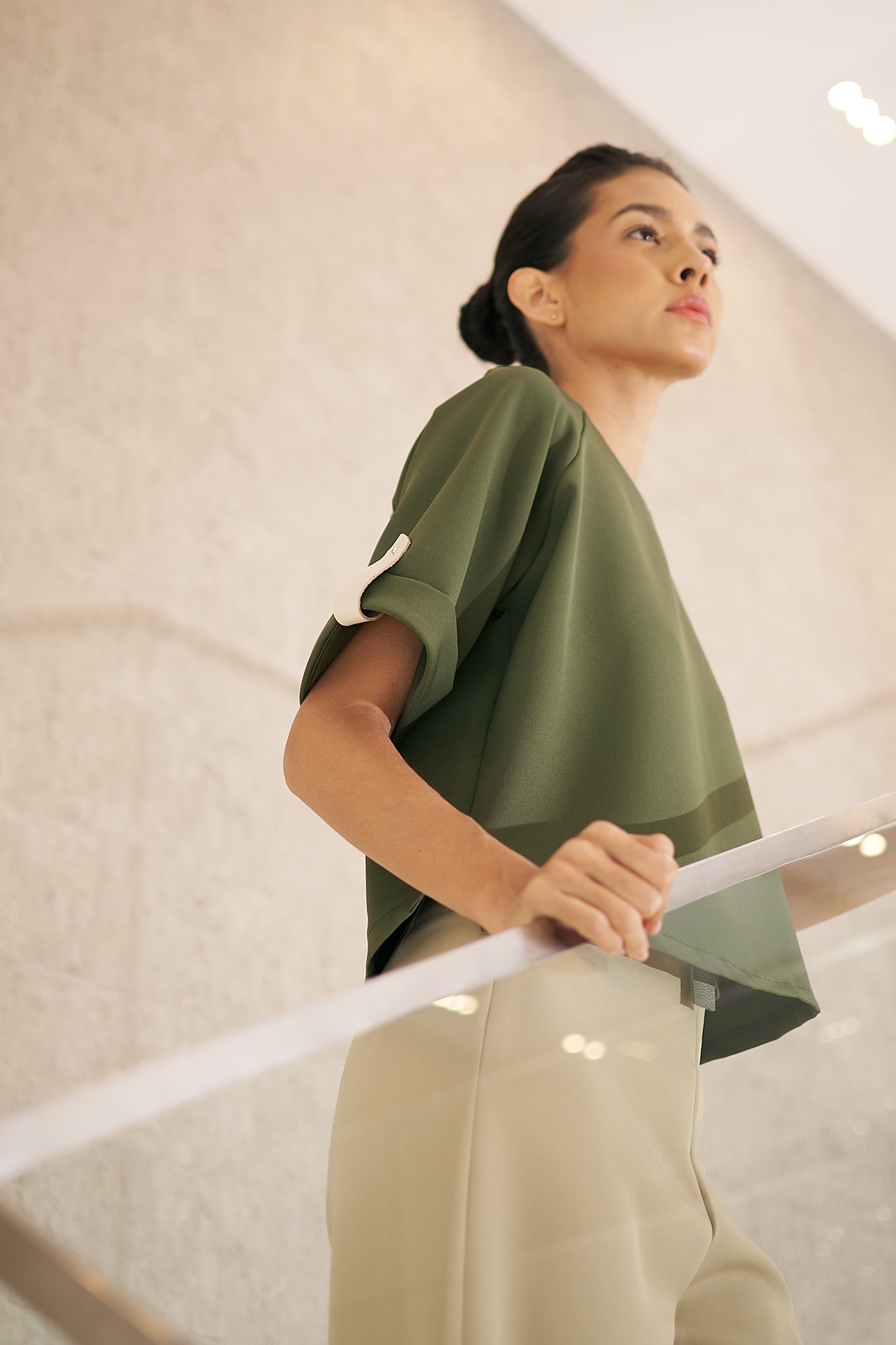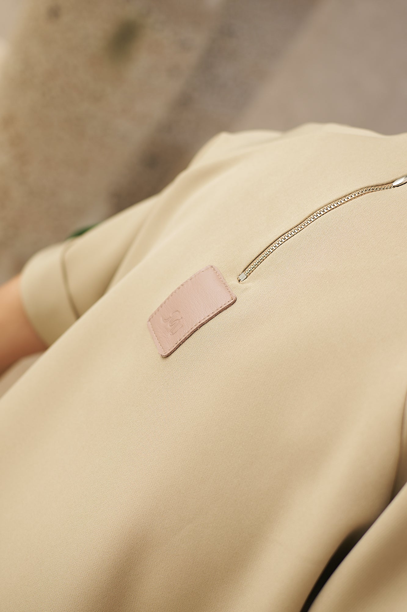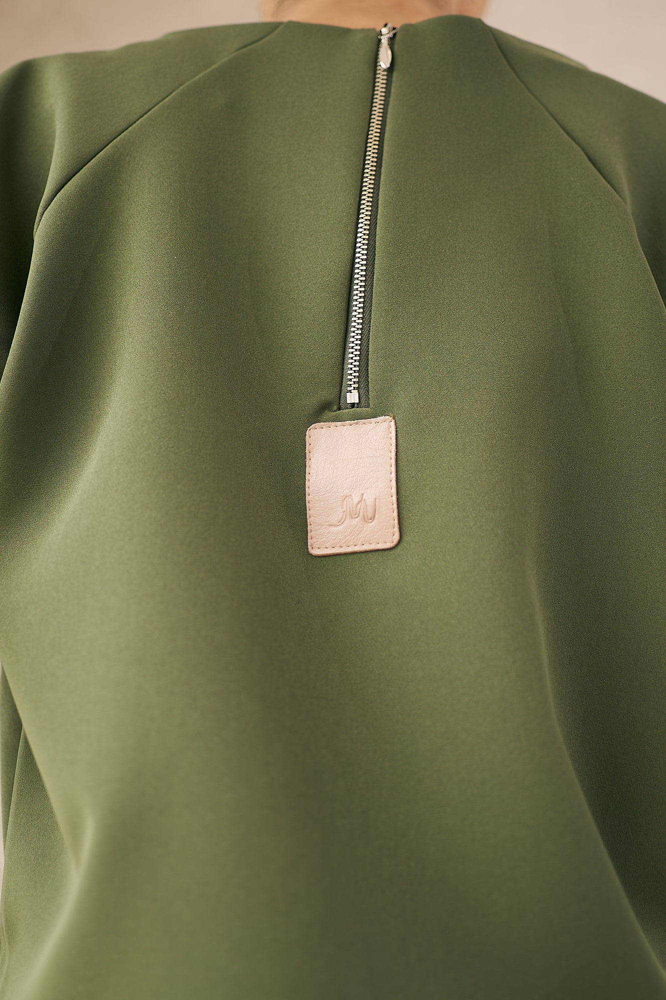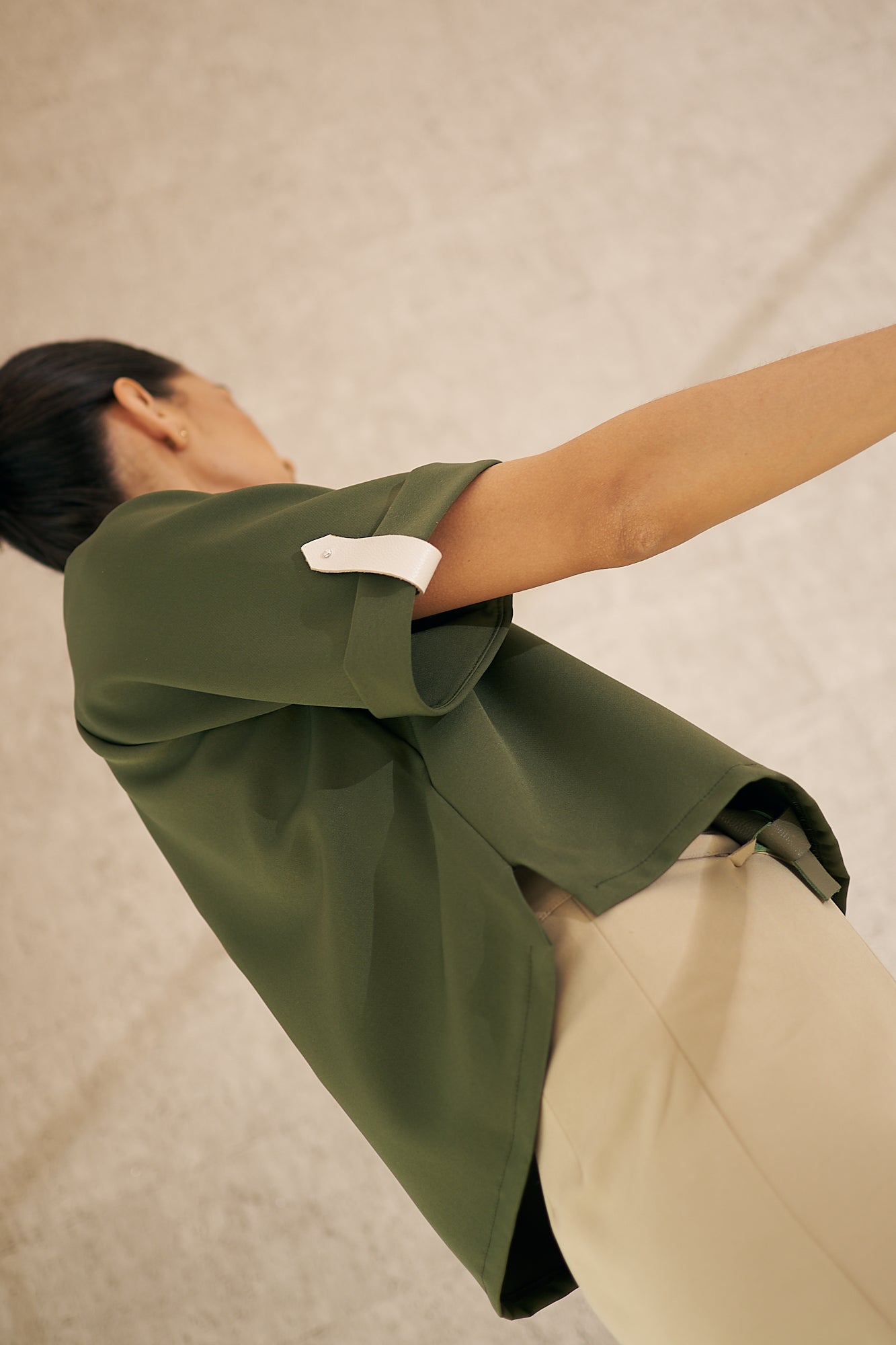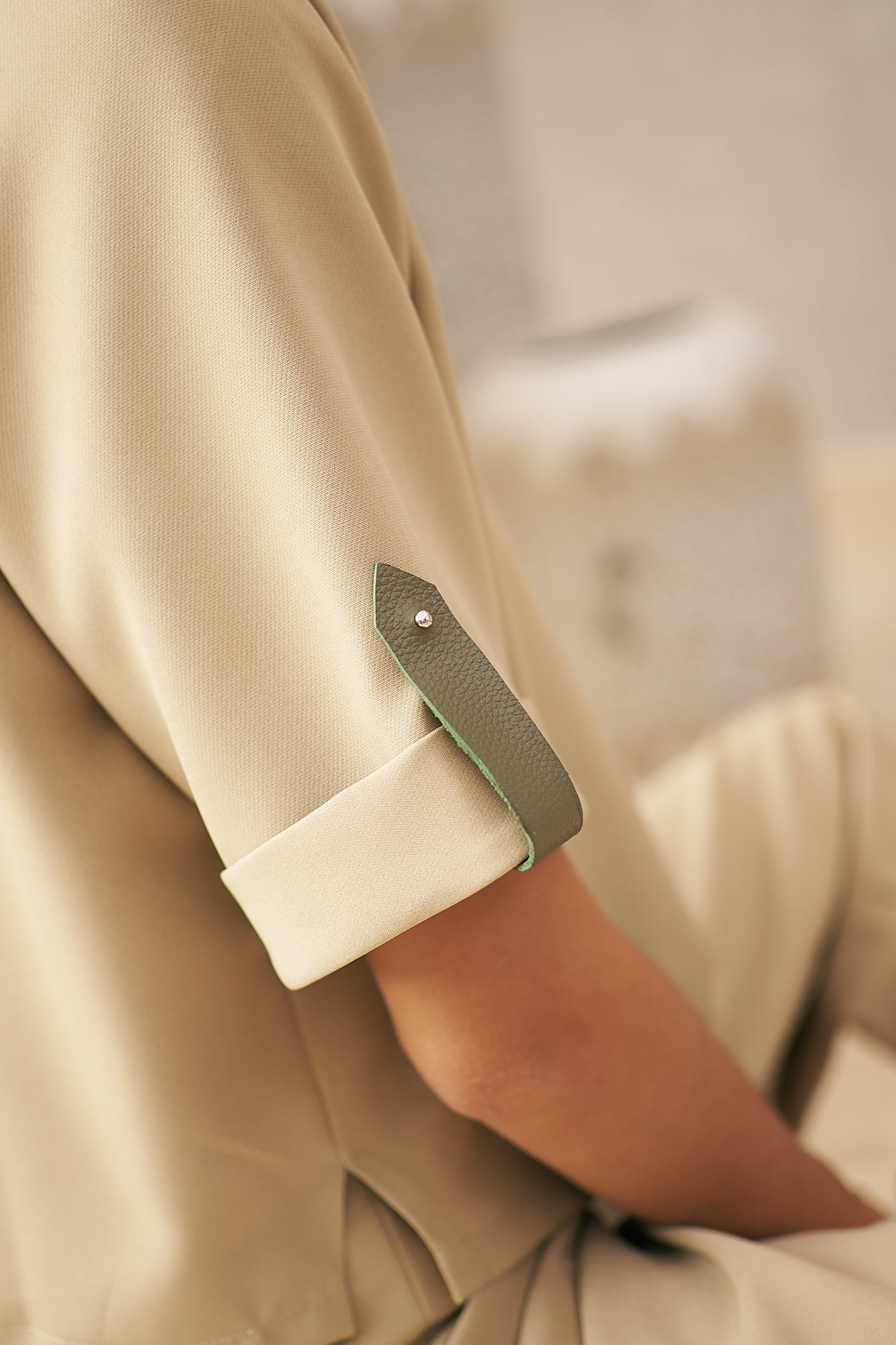 BLUSA CON MANGAS, CIERRE EN ESPALDA EXPUESTO, LARGO A LA PRETINA DE PANTALON, TIRA EN CUERO REMOVIBLE EN LAS MANGAS. COMPOSICION DE LA TELA 90% POLIESTER /10%ALGODON